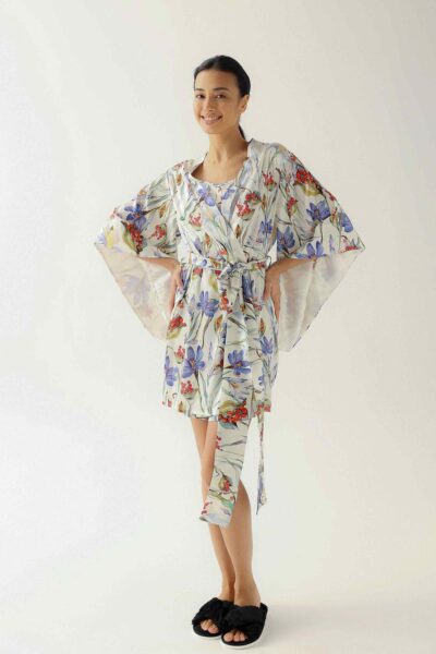 Experience the soaring lightness, tenderness, and comfort of this exquisite garment. The kimono robe is designed to accentuate your femininity and create a truly luxurious experience.