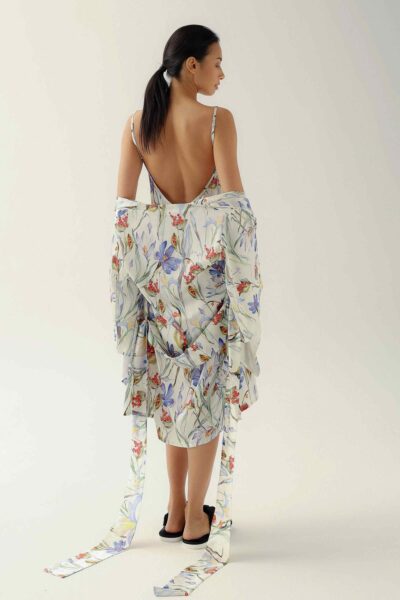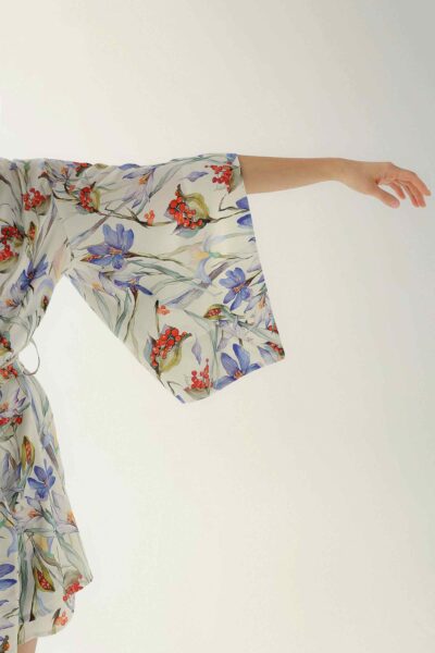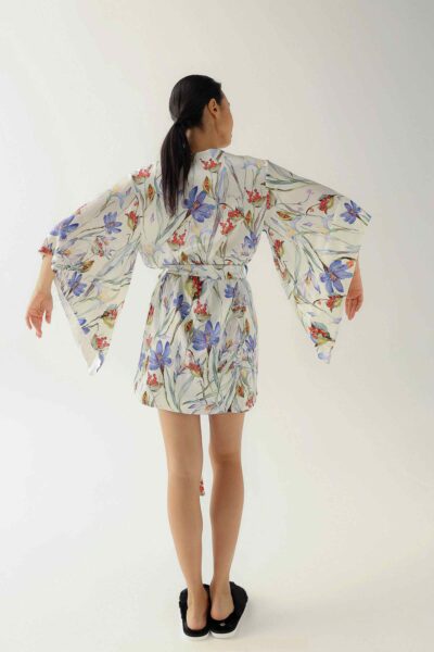 The robe features a unique floral print, adding a touch of personality and elegance. Each piece is meticulously hand-cut, ensuring exceptional quality and attention to detail.